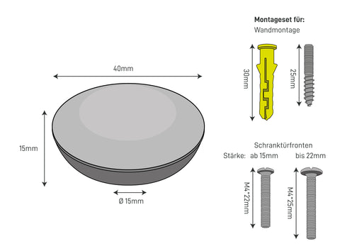 Se incluyen un tornillo M4X25 y un M4X22 por manija, que se puede seleccionar dependiendo de la profundidad del frente en sí. Se incluye un tornillo adecuado con túnelas para el montaje de la pared.